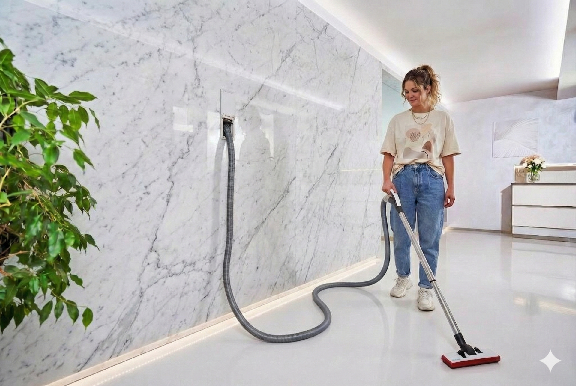 Immagina un lungo corridoio luminoso: un uomo passa con un tubo leggero in mano, collegato a una discreta presa a muro. Nessun rumore di motore in casa, niente trascinamento di apparecchi ingombranti: solo un movimento fluido, stanza dopo stanza, mentre l’aspirazione centralizzata lavora silenziosamente dal locale tecnico.