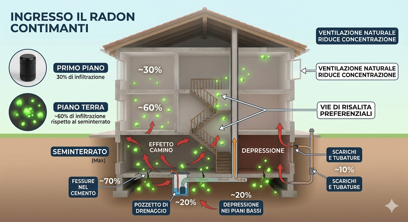 L'immagine qui sopra illustra chiaramente il fenomeno noto come effetto camino. L'aria calda all'interno dell'abitazione è più leggera e tende a salire verso l'alto, uscendo dalle fessure del tetto o dei piani alti. Questo movimento crea una depressione nei piani inferiori (seminterrati e piani terra) che agisce come una vera e propria "aspirazione", risucchiando il radon dal suolo attraverso fondamenta, crepe e passaggi di tubature.