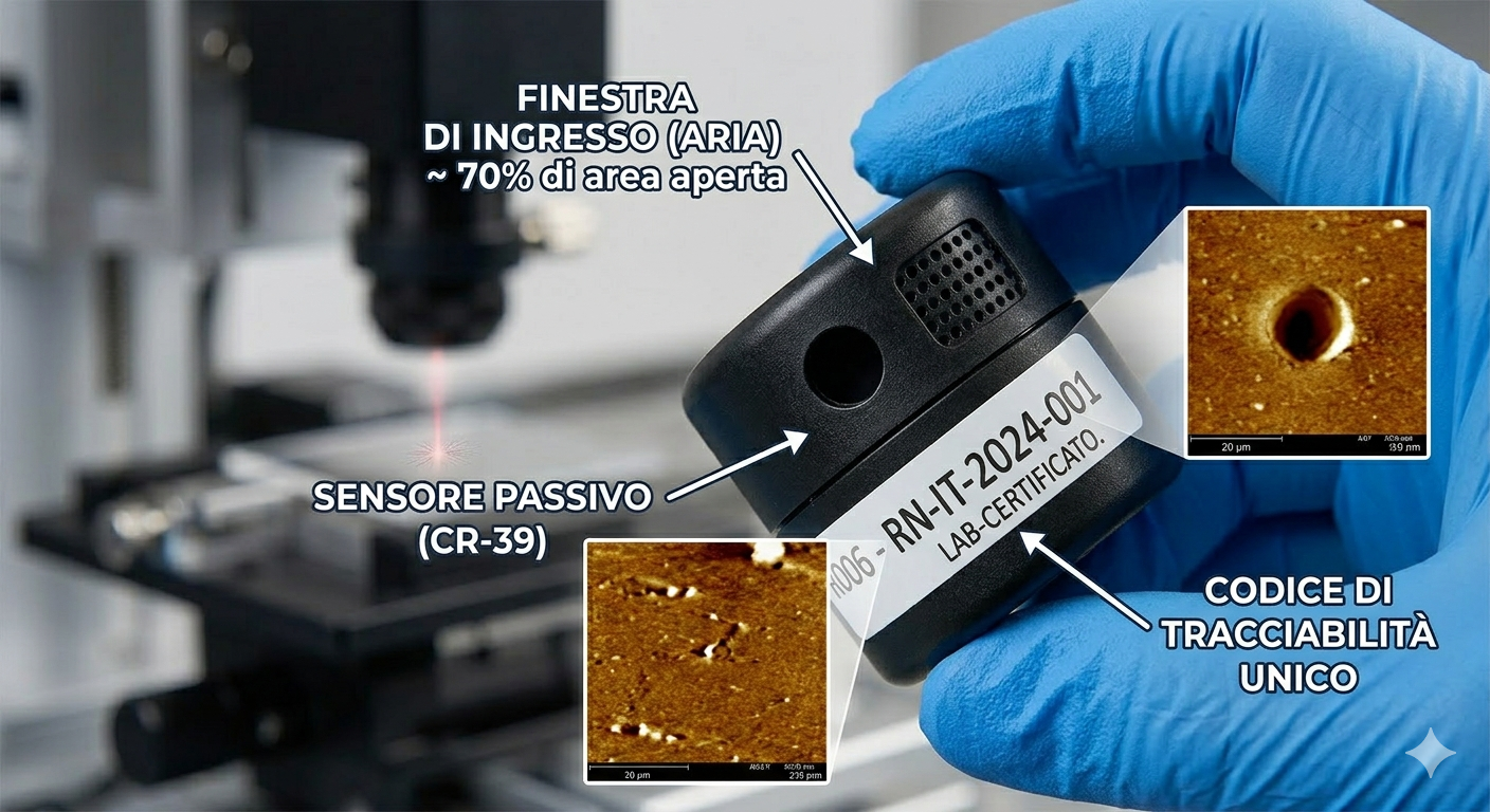 Questi piccoli dispositivi (spesso neri, grandi come un tappo di barattolo) contengono un materiale sensibile che registra le "tracce" lasciate dai decadimenti radioattivi del radon.