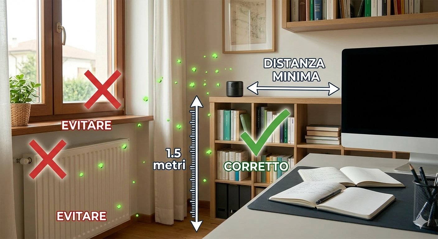 Distanze: Lontano da fonti di calore (radiatori), finestre, porte e angoli morti dove l'aria non circola (evitate le zone segnate in rosso nell'illustrazione).