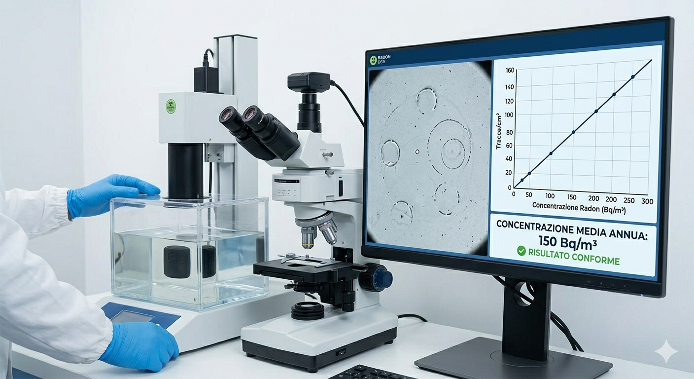 In laboratorio, il materiale sensibile viene trattato chimicamente ("etching") e analizzato al microscopio (come si vede nel monitor nell'immagine). Il conteggio delle tracce radioattive permette di calcolare la concentrazione media annuale in Becquerel per metro cubo (Bq/m^3).